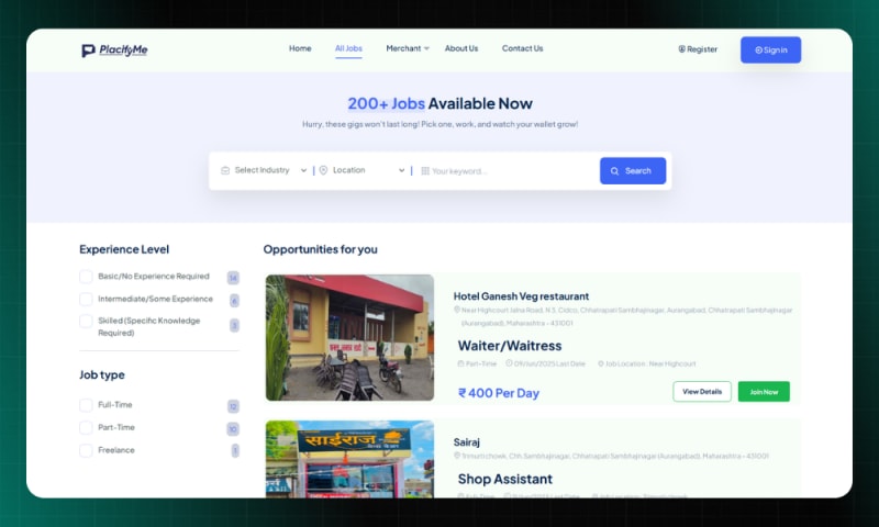 PlacifyMe was built to bridge this gap by creating a hyper-local job ecosystem. The platform enables job seekers to discover nearby work that fits their schedules, while allowing local businesses to access reliable talent without the overhead of traditional recruitment systems.